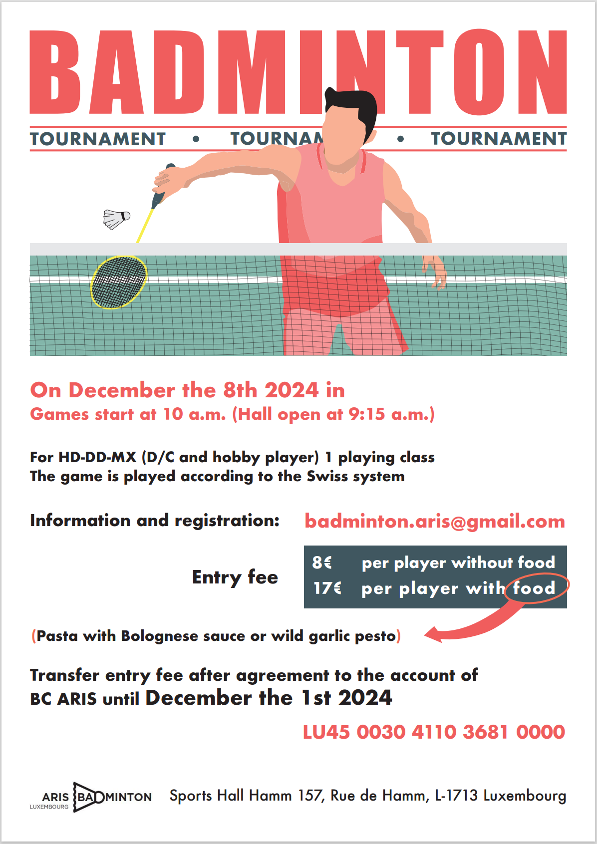 Our club organizes a hobby badminton tournament at the Hamm sports hall on Sunday the 8th of December 2024 located at 157 rue de Hamm L-1713 Luxembourg