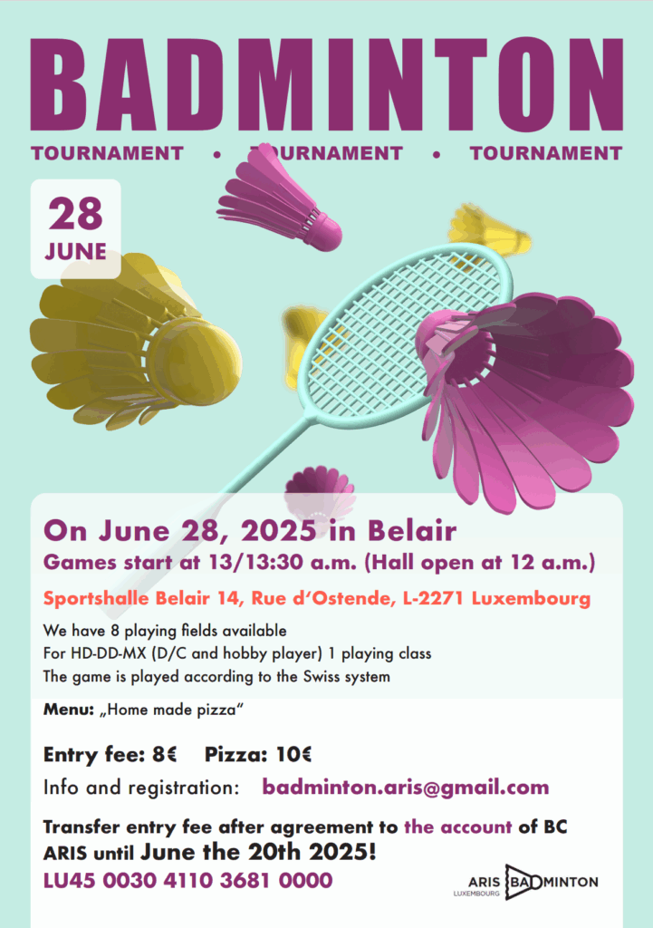 Our club organizes a hobby badminton tournament at the Belair sports hall on Saturday the 28th of June 2025 located at 14 rue d’Ostende L-2271 Luxembourg